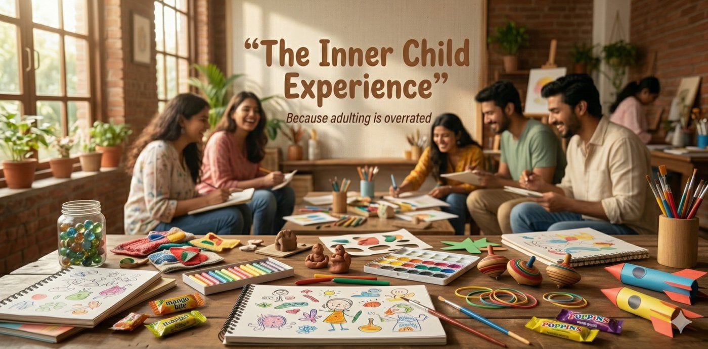 The Inner Child ExperienceA 3+ Hour Immersive Nostalgia WorkshopPlay. Create. Feel again.Somewhere between deadlines, responsibilities, and “adulting”… we stopped playing.The Inner Child Experience is your chance to pause, unplug, and reconnect with a simpler, more joyful version of yourself — through creativity, nostalgia, and shared moments.This is not just a workshop.It’s a curated 3+ hour experience designed to help you unwind, create freely, and relive the little things that once made you happy.✨ What You’ll ExperienceArt Made EasyA fun, beginner-friendly drawing session — no skills required, just expression.Creative Craft ActivitiesHands-on, playful crafts designed to spark curiosity and joy.Clay ModellingGet your hands messy and create something uniquely yours.Nostalgic Games HourRelive iconic school-time and childhood games with a fun, interactive twist.Nostalgia HamperTake home a curated box of childhood favourites that will instantly bring back memories.Why You Should JoinTake a break from routine and mental clutterReconnect with your creative, carefree sideMeet like-minded people in a relaxed, no-judgment spaceExperience joy without pressure or perfectionWho Is This For?Anyone feeling burnt out from “adult life”Creatives and non-creatives alikeIndividuals, friends, or couples looking for a unique experienceNo prior experience needed. Just come with an open mind.⏳ DurationApprox. 3.5 hoursLimited SeatsTo keep the experience personal and engaging, seats are limited.NoteAll materials and the nostalgia hamper are included in your ticket.Terms and ConditionsA mandatory Food & Beverages cover charge of ₹500 per person is applicable at the venue, which is fully redeemable and can be used to order items from the venue menu during the event.By attending this event, participants consent to the use of their photos and videos for Social Sailor marketing and promotional purposes.In the event of workshop cancellation due to circumstances beyond our control-including but not limited to natural disasters, extreme weather, floods, earthquakes, or other acts of God-no refunds will be issued. Participants may, at the organizer's discretion, be offered rescheduling to a future event of similar value.While we strive to start events on time, delays of up to 30 minutes may occur due to unforeseen circumstances.You grew up. But did you grow away from yourself?Come find out.