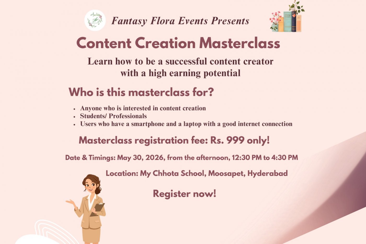 Fantasy Flora Events Presents "Content Creation Masterclass"!In this masterclass, you will learn about how to start your journey as a part-time or a f...
