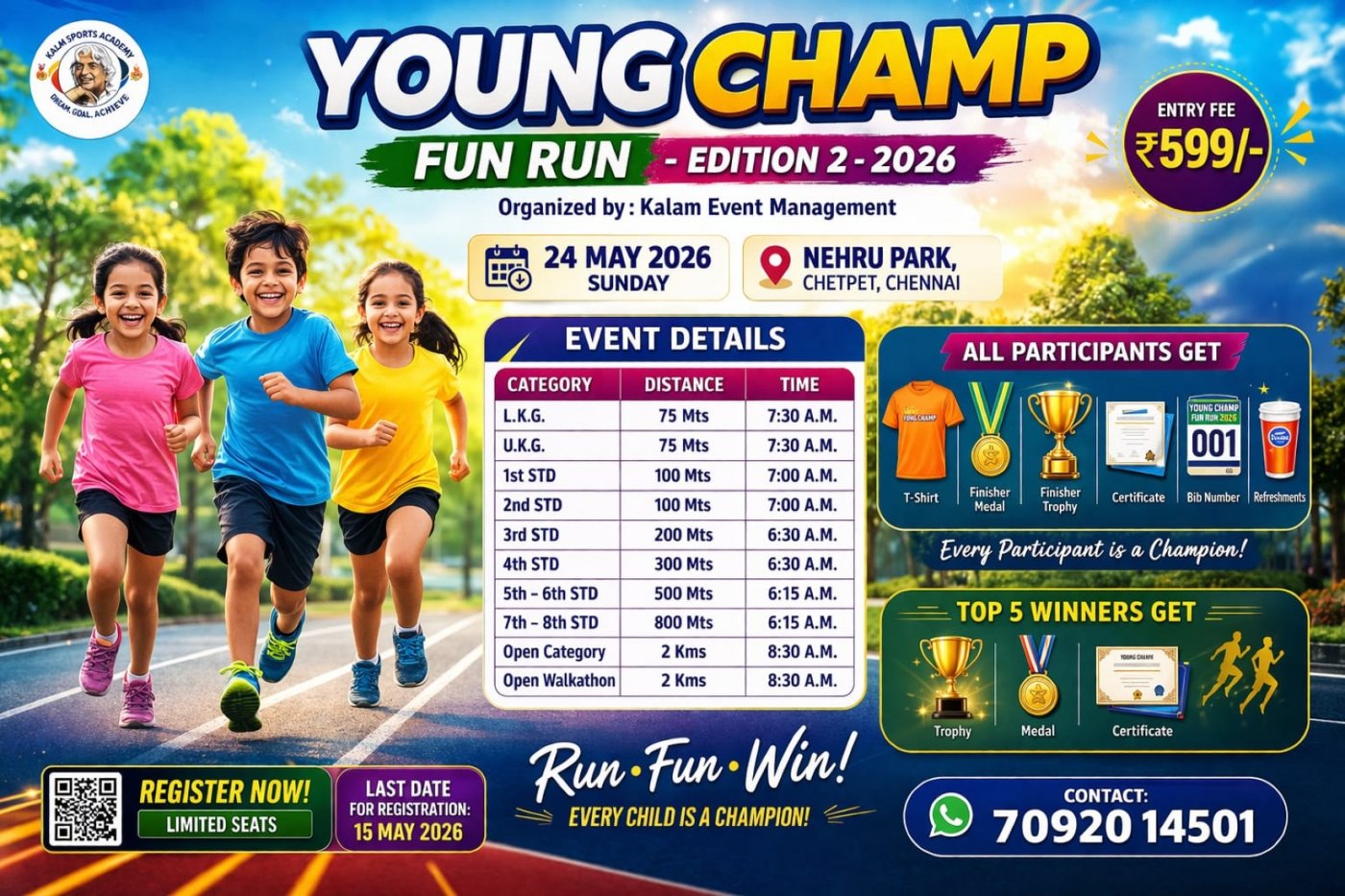 Young Champs Fun Run Edition II, organized by Kalam Event Management on 24th May 2026 at SDAT Nehru Park, Chetpet, Chennai.Categories | Distance |Timi...