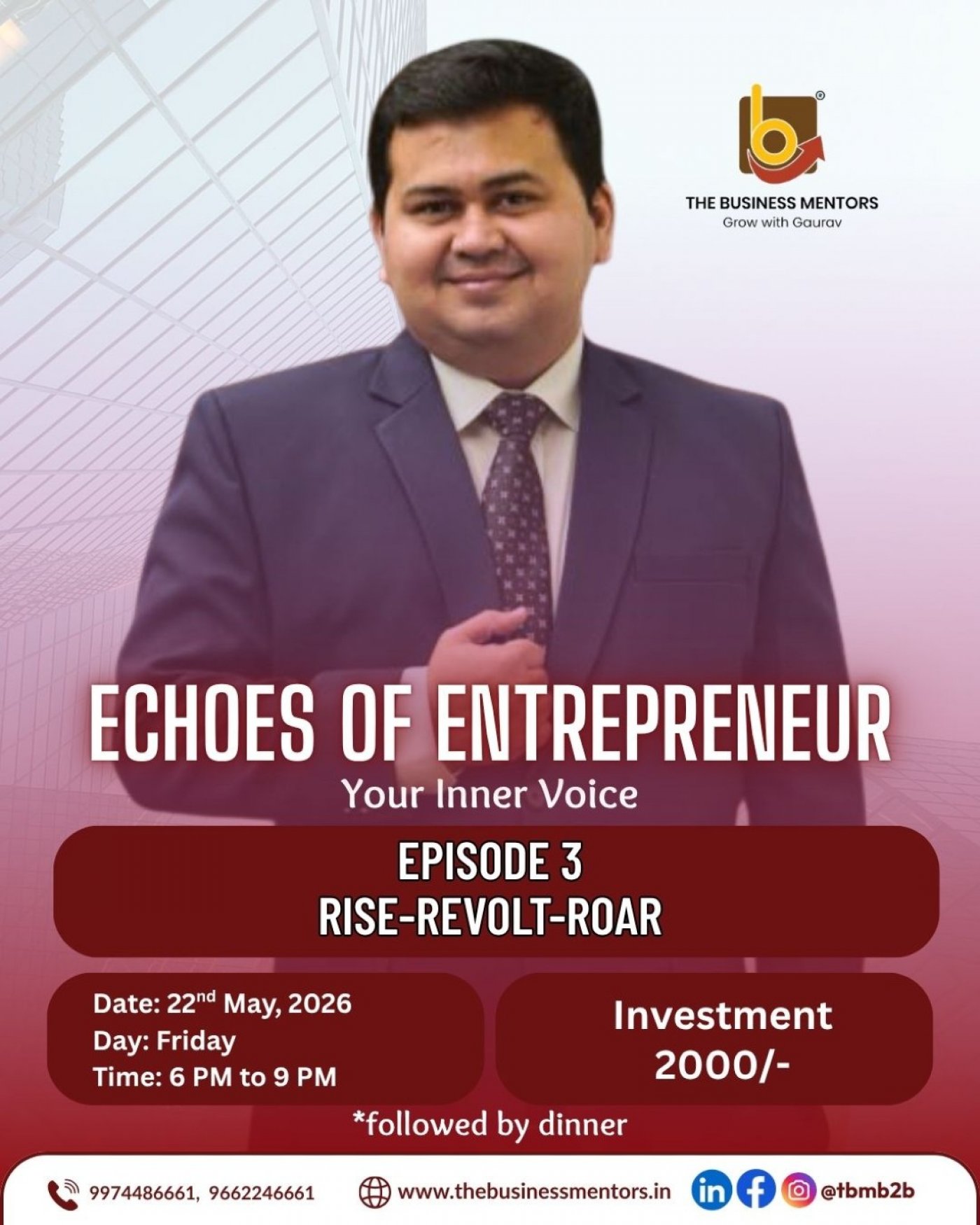 AllEvents > ๐๐ฅ๐๐ฌ๐ฌ๐ข๐ ๐๐ง๐๐ข๐๐ง ๐๐๐ฌ๐ญ๐๐ฎ๐ซ๐๐ง๐ญ ๐๐ง๐ ๐๐๐ง๐ช๐ฎ๐๐ญ > Echoes of Entrepreneur - Your Inner Voice [Ep-3: Rise, Revolt & Roar]