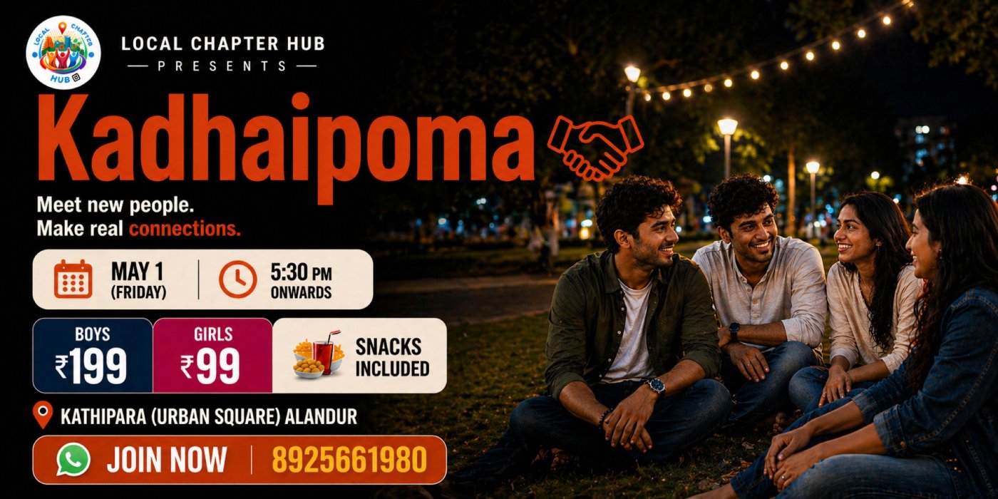 Feeling bored, lonely, or just want to meet new people?Kadhaipoma is your perfect evening to relax, talk, and build real connections in a safe, friend...